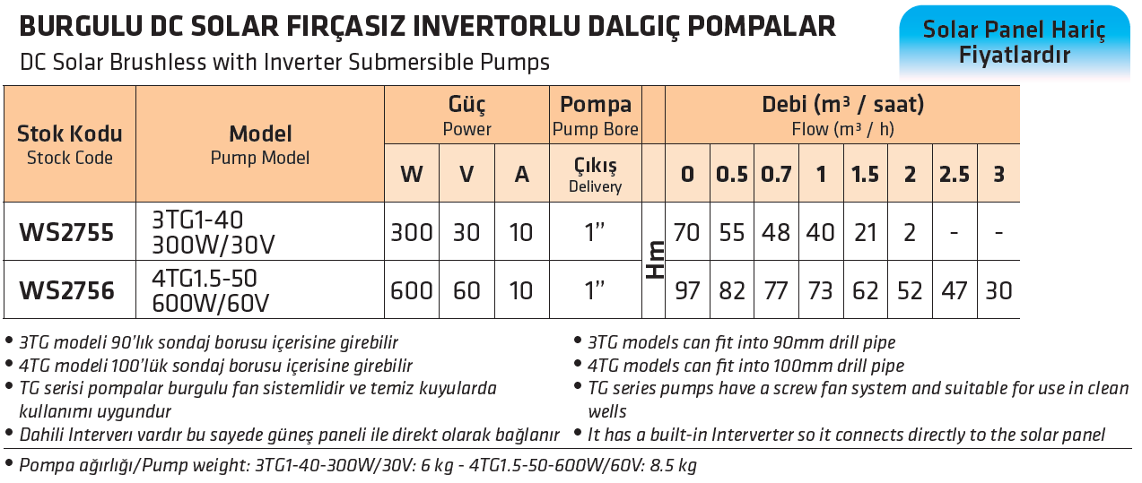 - WATER SOUND 3TG1-40 300W/30V BURGULU DC SOLAR FIRÇASIZ INVERTORLU DALGIÇ POMPASI