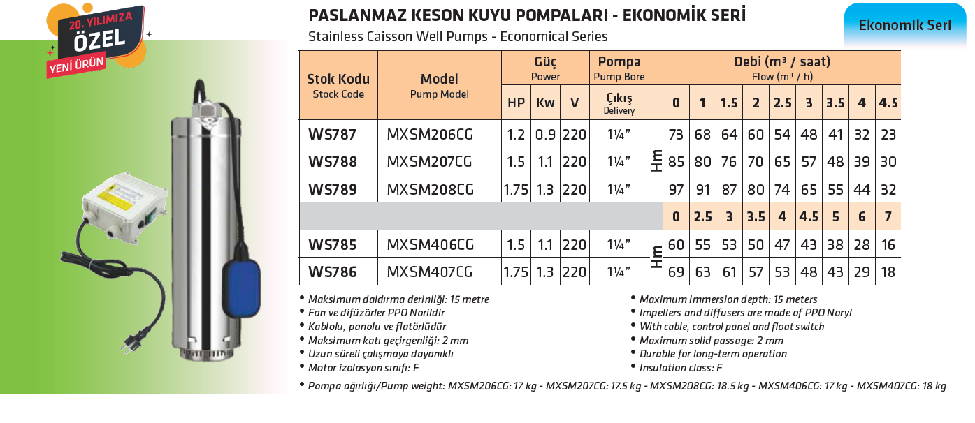 WATER SOUND MXSM206CG 1.2HP 0.5Kw 220V PASLANMAZ KESON KUYU POMPASI