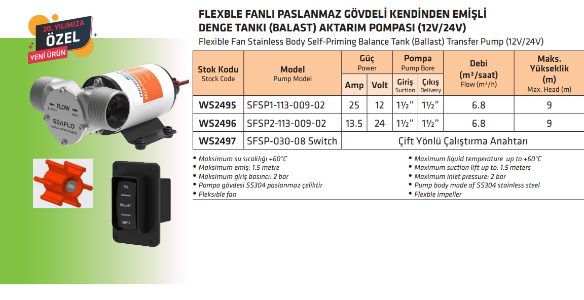 WATER SOUNDSFSP2-113-009-02 24V FLEXBLE FANLI PASLANMAZ GÖVDELİ KENDİNDEN EMİŞLİ DENGE TANKI (BALAST) AKTARIM POMPASI